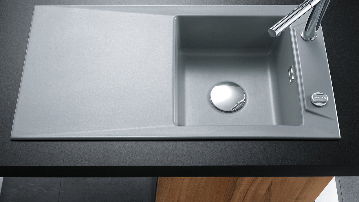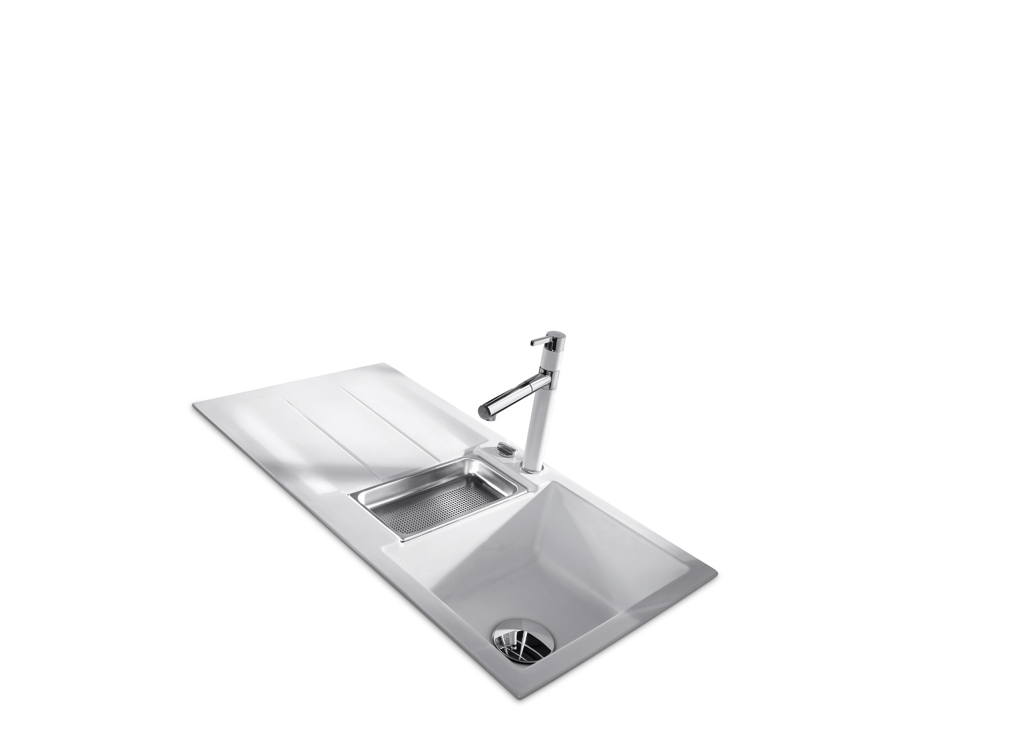 The harmonious design of this kitchen sink places high demands on ceramic shaping technology. The drain board runs off nearly horizontally at the sides, allowing a continuous plane to be formed when installed flush with the work surface. The two basins feature perfectly fitted standard stainless steel gastronomy containers. The basin in the middle allows vegetables and other cooked foods to be safely set down for drainage.