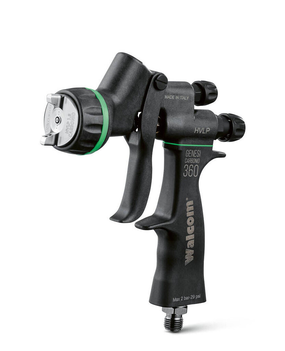 Genesi Carbonio 360 is one of the lightest professional spray guns for car refinishing, made of carbon fibre and an aluminium core – an evolution of the technology of forged aluminium. It is ergonomic, antistatic and heat insulating. With a 5-axis CNC machine, it is manufactured in a single step achieving great precision and precise alignment of all components.