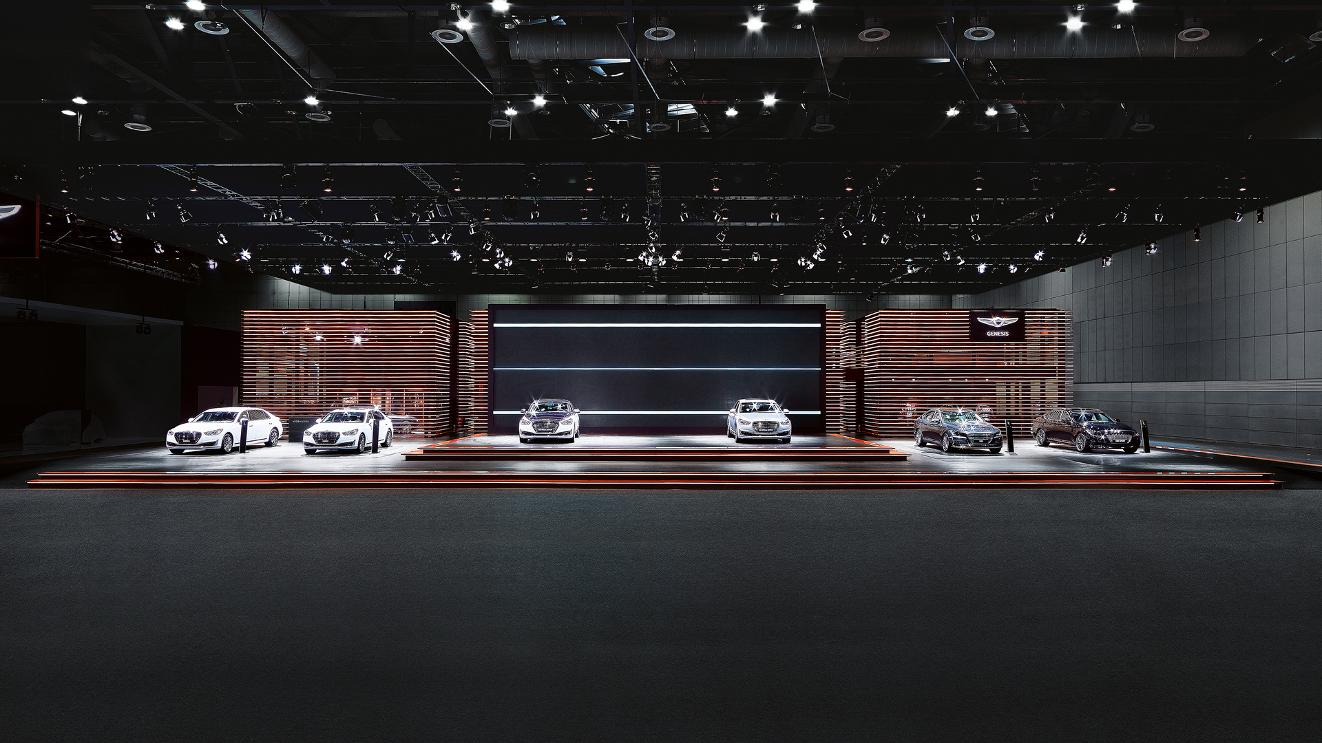 The booth presentation and identity concept by Genesis at the Seoul Motor Show, South Korea, focused on communicating the key ideas of “Global, sustainable, Korean, straightforward”. Consistently concentrated on simple lines, the concept followed the principle of a layered structure. Stackable pallets were used to shape the architecture and define the spaces. Reduced to only copper and black wood material, the resulting stage was enhanced by atmospheric lighting and subtly incorporated digital media.