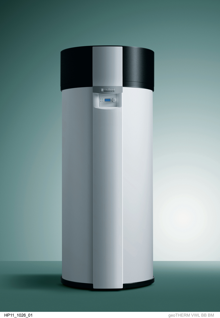 The geoTHERM domestic hot water heat pump offers the possibility of using renewable energy in a flexible way, as it can be integrated into existing heating systems simply by plugging it in (the so-called “plug and play” concept). During its use, it extracts heat from the ambient air to warm water. Natural warmth can be extracted in both summer and winter. The cool air that comes out of the heat pump can be used to cool a cellar, for example, and keep it dry. Solar energy sources can also be connected to it. geoTHERM is elegantly incorporated into the casing of the hot water storage tank along with its user interface and technical components. The coherent design concept of the hot water heat pump harmoniously brings together high technical specifications and the typical Vaillant product design.