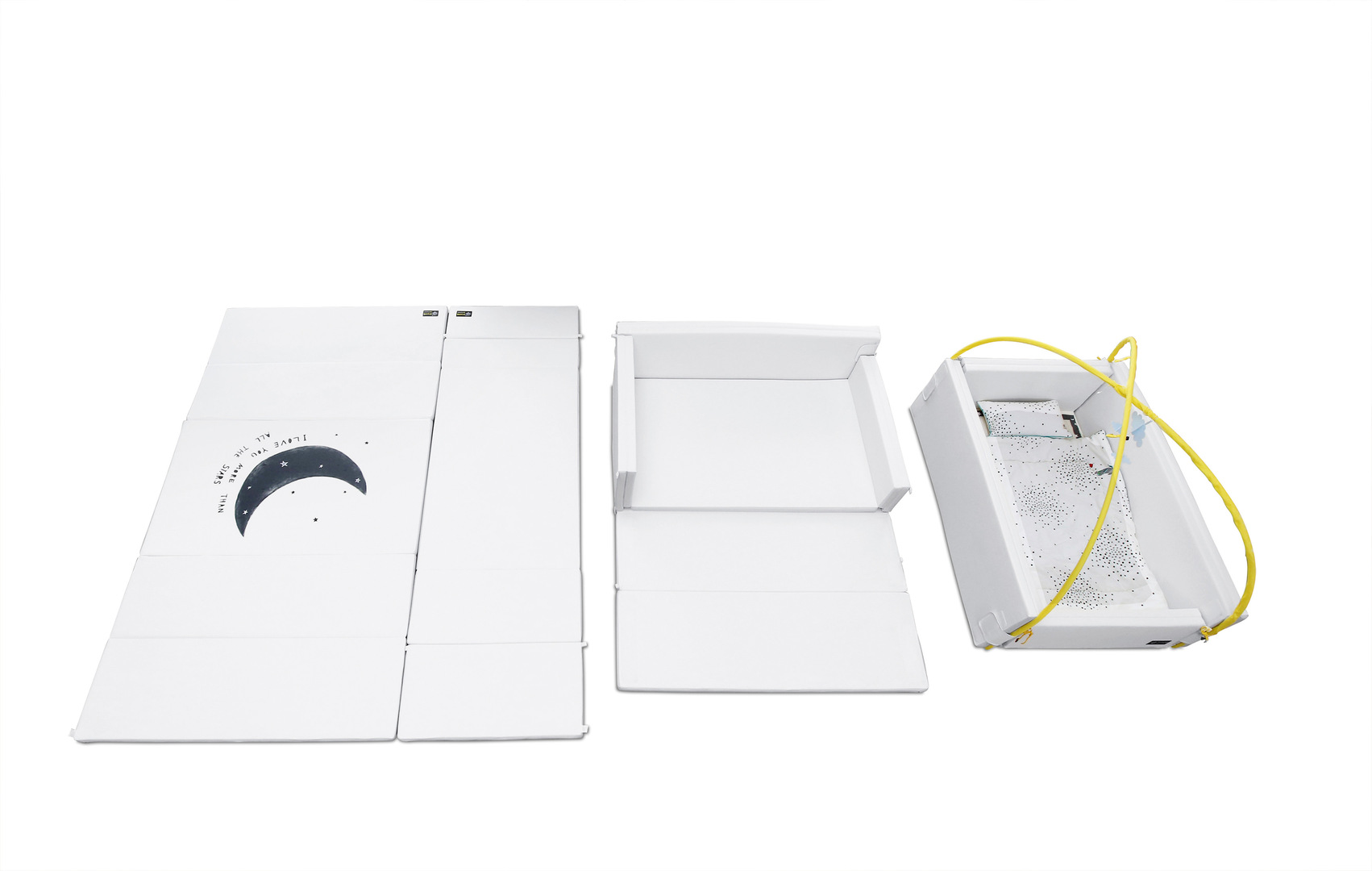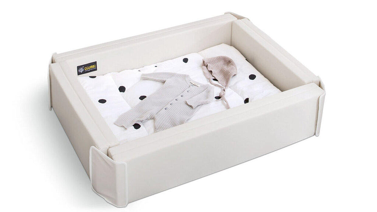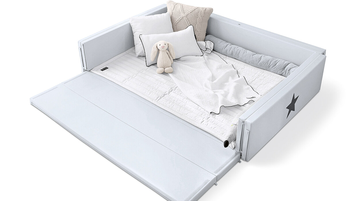 The Legend Bumper Bed – New Moon consists of two mats, each divided into five parts. Because of this, it can be folded in various ways, no matter how much or little room is available. The bed can be arranged in twelve different forms, for example, it can be folded into a baby bed with a surrounding edge 44 cm high, a play mat or a playing house, each held in place by a Velcro fastener. The mats are 4 cm thick and made of a material with impact absorbing properties so that children will not be injured even when romping wildly on the mat.