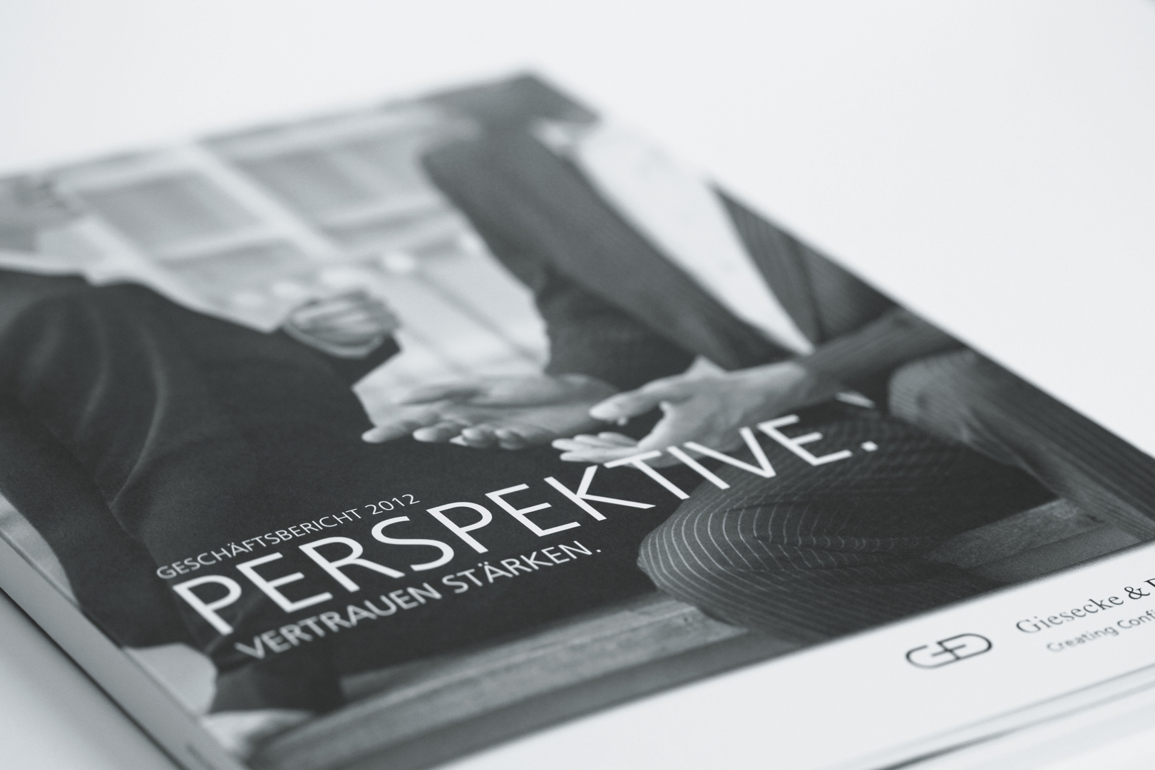 This annual report marks the beginning of a three-year concept for Giesecke und Devrient GmbH. The focus for 2012 is on the business-to-customer segment. The design concept is based on the idea of providing the reader with a look behind the scenes. The three business segments Paying, Communicating and Identity are each addressed on a double-page spread and illustrated using a situation of everyday life the customer is familiar with. The black and white photography has a particularly high-quality look. The reader is interactively introduced to the products and services behind the situations with the help of a separately opening page that is made possible by the use of a Japanese bookbinding technique and a punched perforation.