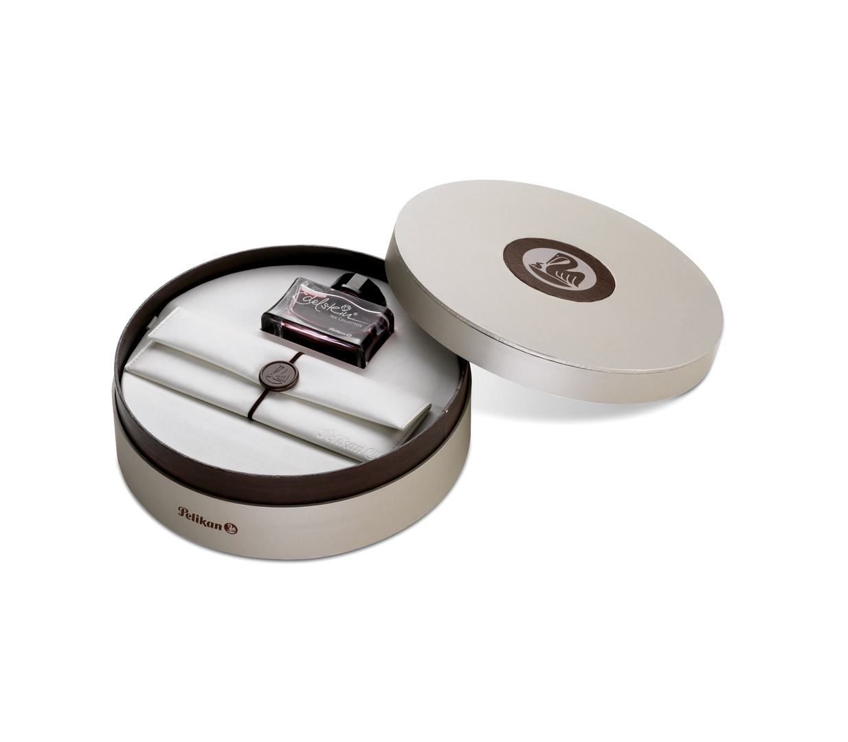 This box has been developed to present one or two high-quality writing instruments. The round gift box, which measures 22 cm in diameter, is reminiscent of a hat box. Inside the box, the writing instruments are protected by a small bag. Furthermore, it provides space for an ink bottle, and underneath the insert there is room for a card or some information about the gift.