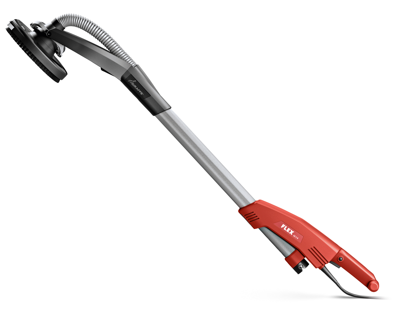 The Giraffe GE 5 R is equipped with a flexible, rotatable grinding head with an open segment, which enables almost dust-free sanding of surfaces and edges. The head and motor are positioned opposite each other, thus automatically balancing the device and enabling easy handling. The spade grip additionally supports ease of use and can also serve to put the sander down. The extension module increases the working height by 50 cm.