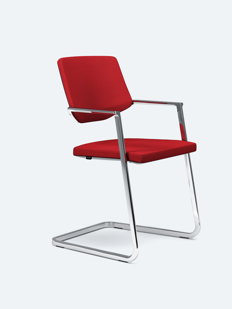 The giroflex 656 cantilever chair is designed for use in reception areas and conference rooms. The elevated, rectangular steel pipe is bent in one piece from base to armrests. The latter are made of die-cast aluminium and run around the back, integrating into the fabric-coated backrest. The seat and backrest cushioning elements are precisely cut, communicating clear design with a delicate and distinctive profile.