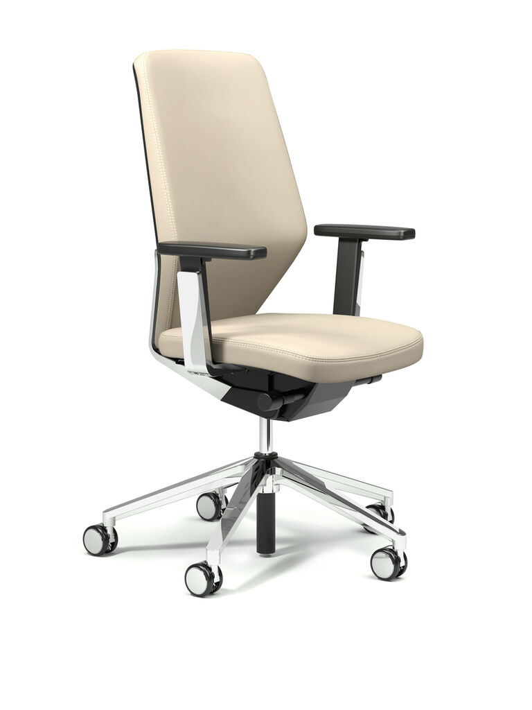 The concept of the swivel chair giroflex 656 integrates three different back heights. The fabric-coated back section is supported by a narrow frame, which statically connects the die-cast aluminium element to its mechanical counterpart. The seat base receives its characteristic appearance through a V-shaped frame, featuring an effect that is both functional and aesthetic. Together with the high and exclusive 5-arm base, these metal parts define the systematic design of the chair and lend it a delicate but also distinctive look. The chair proves flexible through a range of technical elements: the new shiftmove synchronised mechanism, for example, enables an adjustment range of 45 to 120 kg in eight precise steps and is thus easily adapted to most users. The die-cast aluminium armrest supports are tapered to provide a sharply inclined surface for the height-adjustable armrests. The cushion fabric is available in leather and other high-quality fabrics. To cater to the taste of all customers, all aluminium parts are available in both polished and coated variants.