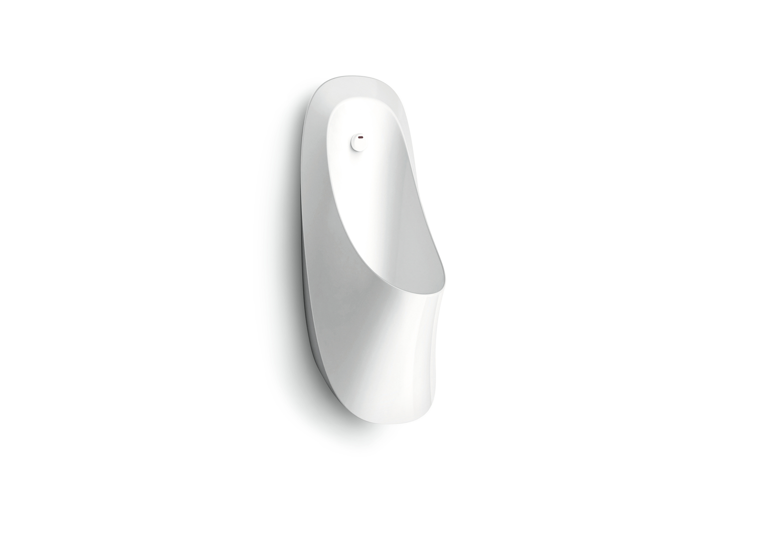 The design of the Glenn urinal was inspired by the lightness of a boat on the sea. Its curved and one-piece moulded surface has no gaps and is therefore easy to clean. The racetrack-shaped sloped surface reduces water splashes and thus increases hygiene. The smooth ceramic glaze features antibacterial properties that protect against infections. This is complemented by an electrolytic water sterilisation technology applied after each use.