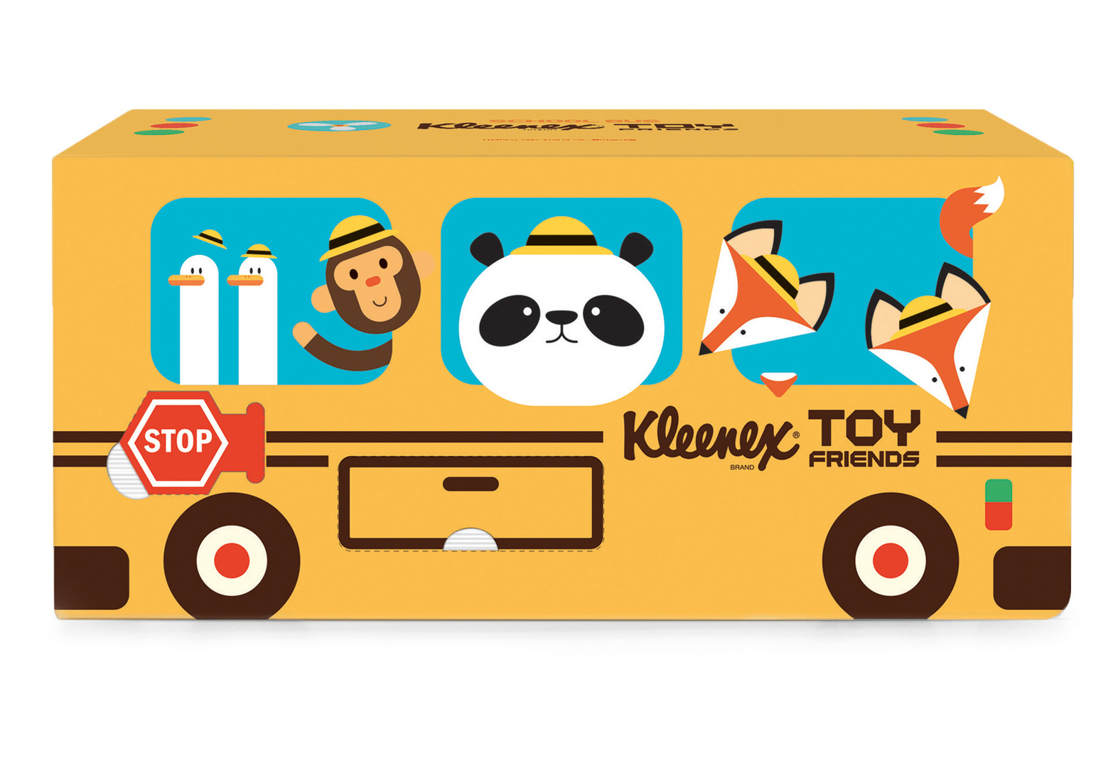 The objective was to create a playful packaging for the new Kleenex Toy Friends sub-brand that contributes to the stimulation of children’s development and imagination. Due to the fact that buses are a favourite toy of many children, the square shape of the tissue box was utilised to feature the image of a school bus, jungle bus or safari bus. Fold-out stop signs as well as windows increase the fun and interactive aspect. The packaging for wet tissues is designed so that the tissue is pulled out of the animal’s mouth. The name tag on the side of the packaging additionally allows for personalisation.