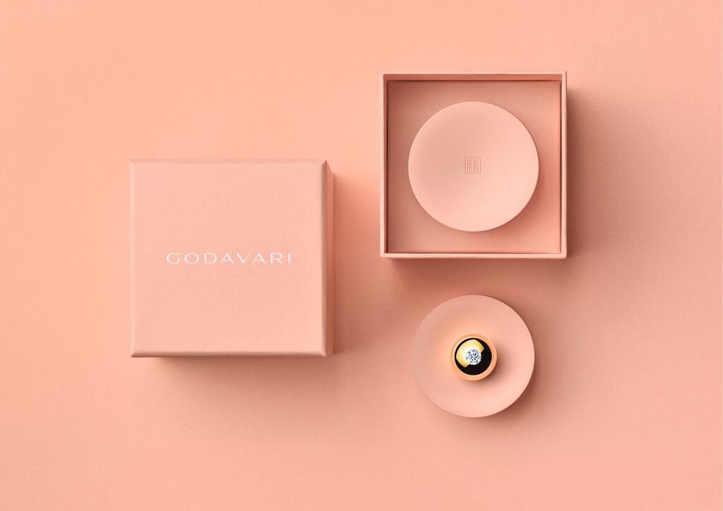 Each Godavari brand diamond is set in a patented coral resin or customisable precious metal globe, allowing bespoke rings to be customised to suit individual styles. The packaging adopts the geometric shapes of early 20th century design and focuses on contemporary luxury. The delicate coral colour is inspired by the client’s love of peonies. The curves in the protective jewellery box enhance the display effect of the globe. The jewellery case is cast in a single composite resin, formulated to feel weighted. No toxic adhesives are used. The resin has a velvety soft feel and is designed to last a lifetime.