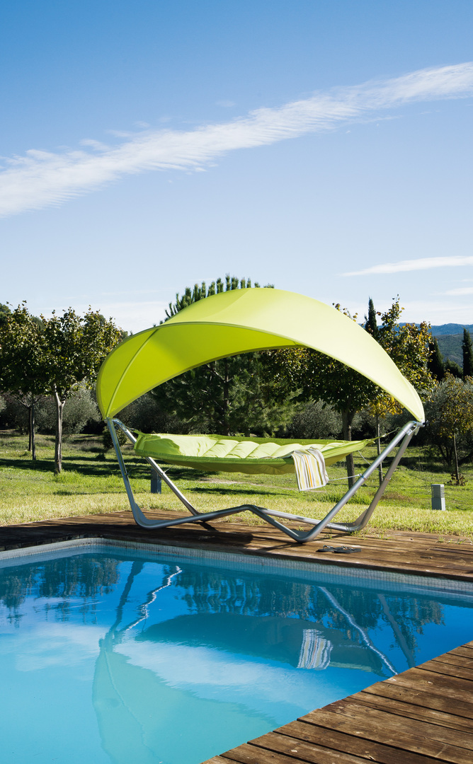 This hammock is reminiscent of a Venetian gondola which floats gently over the water. The height-adjustable lying surface is made from recycled plastic bottles and adapts itself to the user’s requirements. The reinforced frame, along with well-considered connecting elements and fourfold tilt protection, assures the necessary safety. The hammock may also be equipped with an awning.