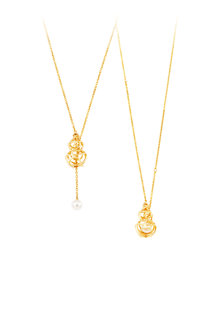 The Good Fortune Gourd jewellery collection consists of a necklace, ring and earrings. They are all ornamented with elements in the shape of a calabash, a traditional Chinese lucky emblem. It represents success and good harvest. A pearl is enclosed in the pendant of the bracelet which can be detached or worn attached. The earrings can be worn optionally only as pearl studs or included in the suspended calabash elements.