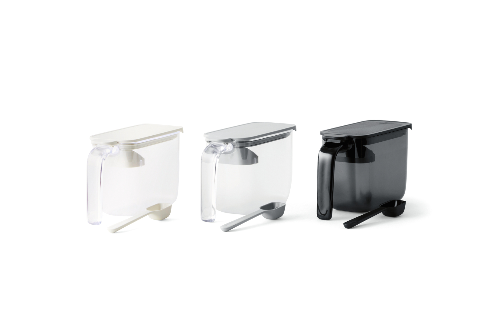 These food containers come with airtight lids that are easy to open thanks to a built-in lever. As soon as the lever above the handle is pressed, the lid opens up to the other side. A rubber seal all around the lid ensures salt, sugar and other contents stay dry. The 5 ml measuring spoon supplied can be scraped against a surface integrated into the container to ensure precise quantities. This surface can also be used to deposit the spoon, so it won’t sink into the contents.