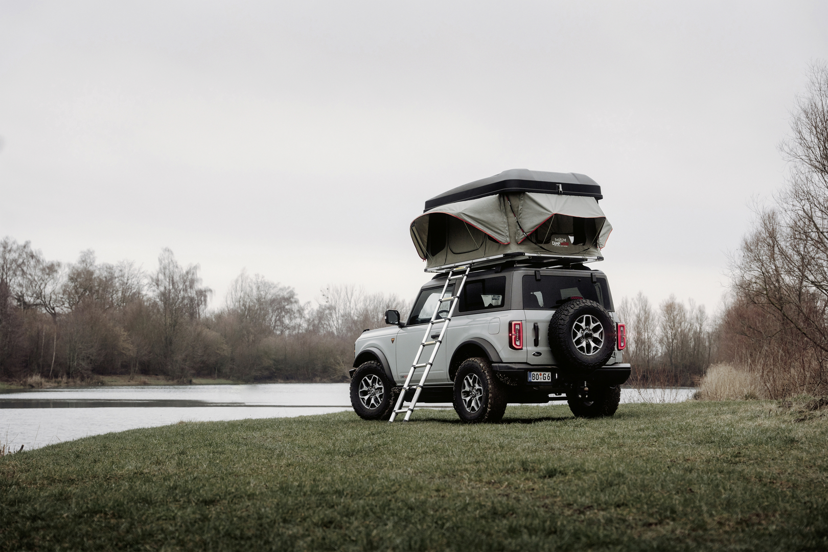 Good Vibes is a roof tent that opens vertically with the help of gas pressure dampers. Due to the curvature of the fibreglass hard shell, which is coated with a matt black scratch-resistant coating, it offers a lot of headroom inside when open. When closed, sleeping bags and similar items can be stored under the shell. Covered openings on all four sides protect against the ingress of rain. The glass fibre-reinforced thermoplastic honeycomb floor gives the base plate the utmost stability, despite its low weight.