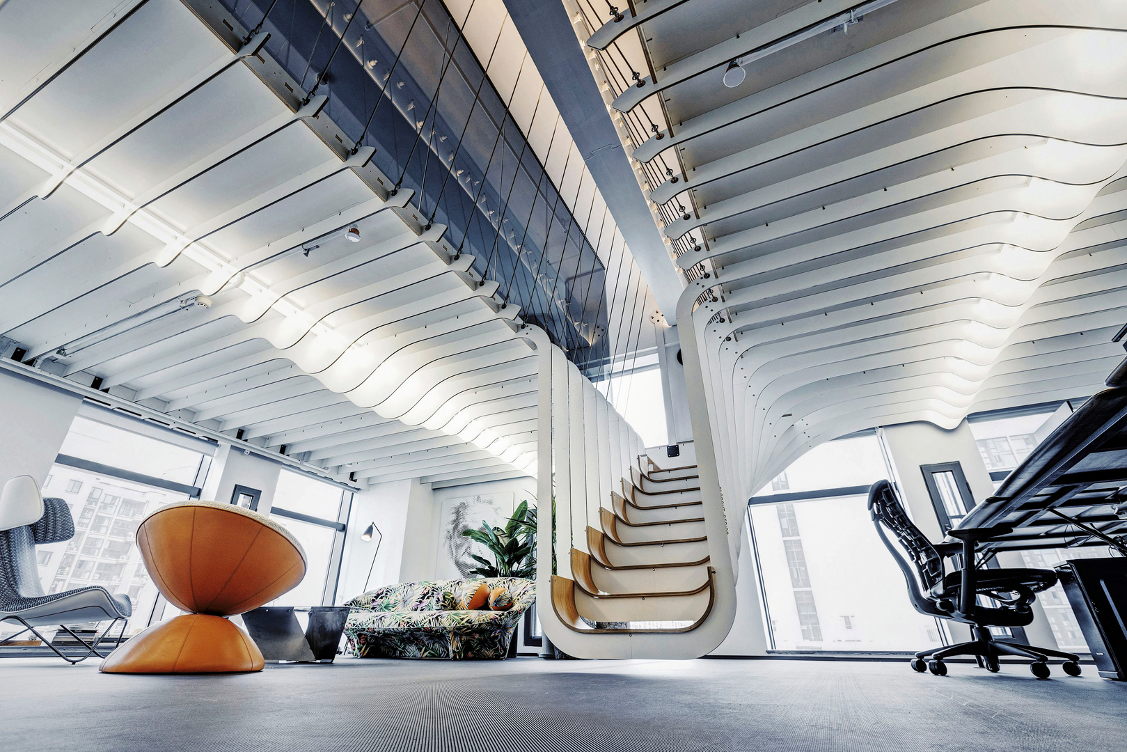 The interior design of this office space follows the core ideas of sustainability and environmental protection and is guided by parametric design and processing methods. The office comprises two levels, with the upper one created by suspending a baseplate that is only 18 mm thick. The main building material is an iron plate from which individual components, such as the staircase and ceiling structure, were laser cut. The individual parts can be easily assembled with the help of metal or wooden mortice and tenon joints.