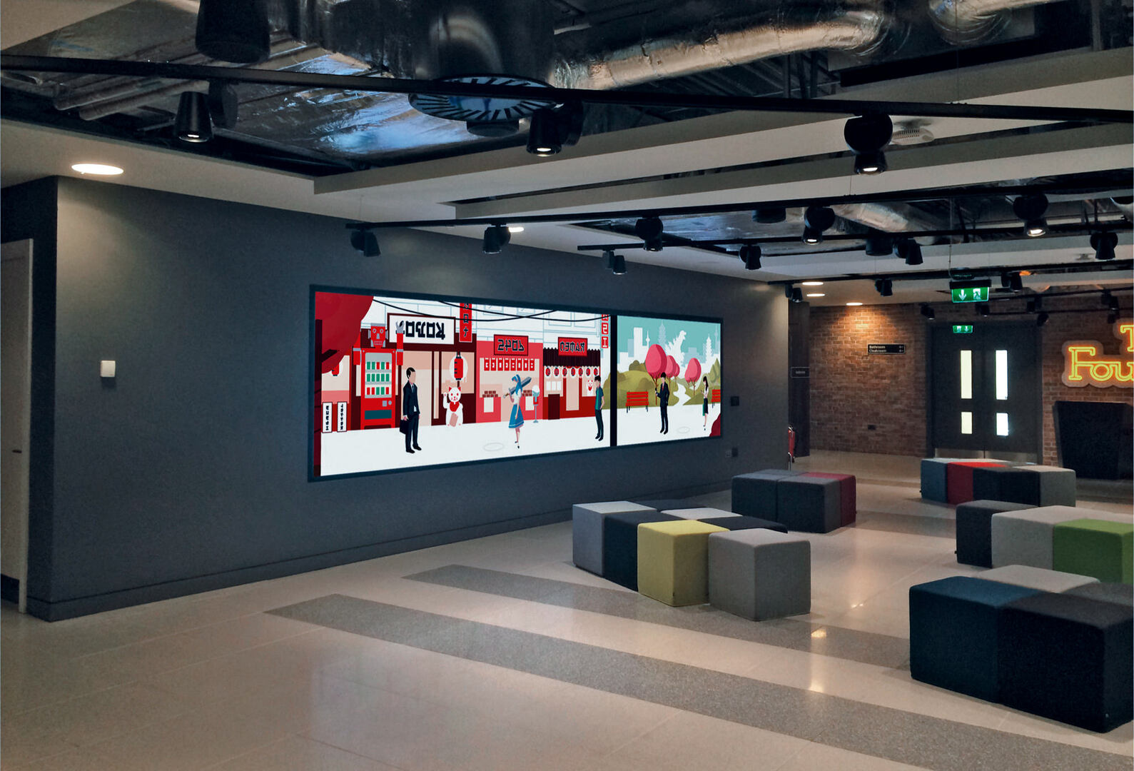 Created as a gesture-controlled game for Google’s experience centre The Foundry, the interactive video wall engages visitors in a dialogue about the role played by the smartphone in everyday life. Capturing the company’s playful style, its interface features a modular game framework based on interaction. Personalised by changing assets such as background scenery, shops or street furniture according to country, real characters and typographic styles were implemented to add relevance to the different nationalities visiting the centre.