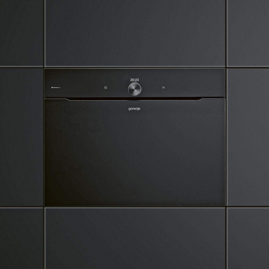 This built-in oven from the Gorenje Compact Built-in Ovens Series G800 Infinity Line offers steam and microwave functions in a space-saving 45-cm format, making it ideal for small households or modular kitchen concepts. It is operated via a precise control knob and a clear touch display. Fast preheating and even heat distribution ensure energy-efficient preparation. The pressure-sensitive handle-free door effectively showcases the seamless black glass front.