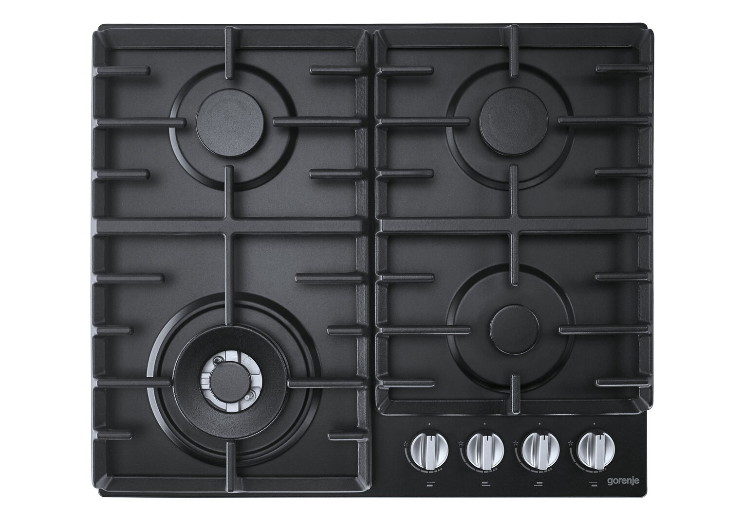 This gas hob with a large cooktop has a flat, enamelled surface which is durable and easy to clean. The cast iron, asymmetrically designed pot supports are so designed that they form together one large cooking surface, which extends over the whole cooktop, allowing the pots to be easily shifted. A powerful wok burner is located at the front, thus easing the use of heavy pots. Thanks to ergonomic pot supports and self-ignition, one-handed operation is possible.