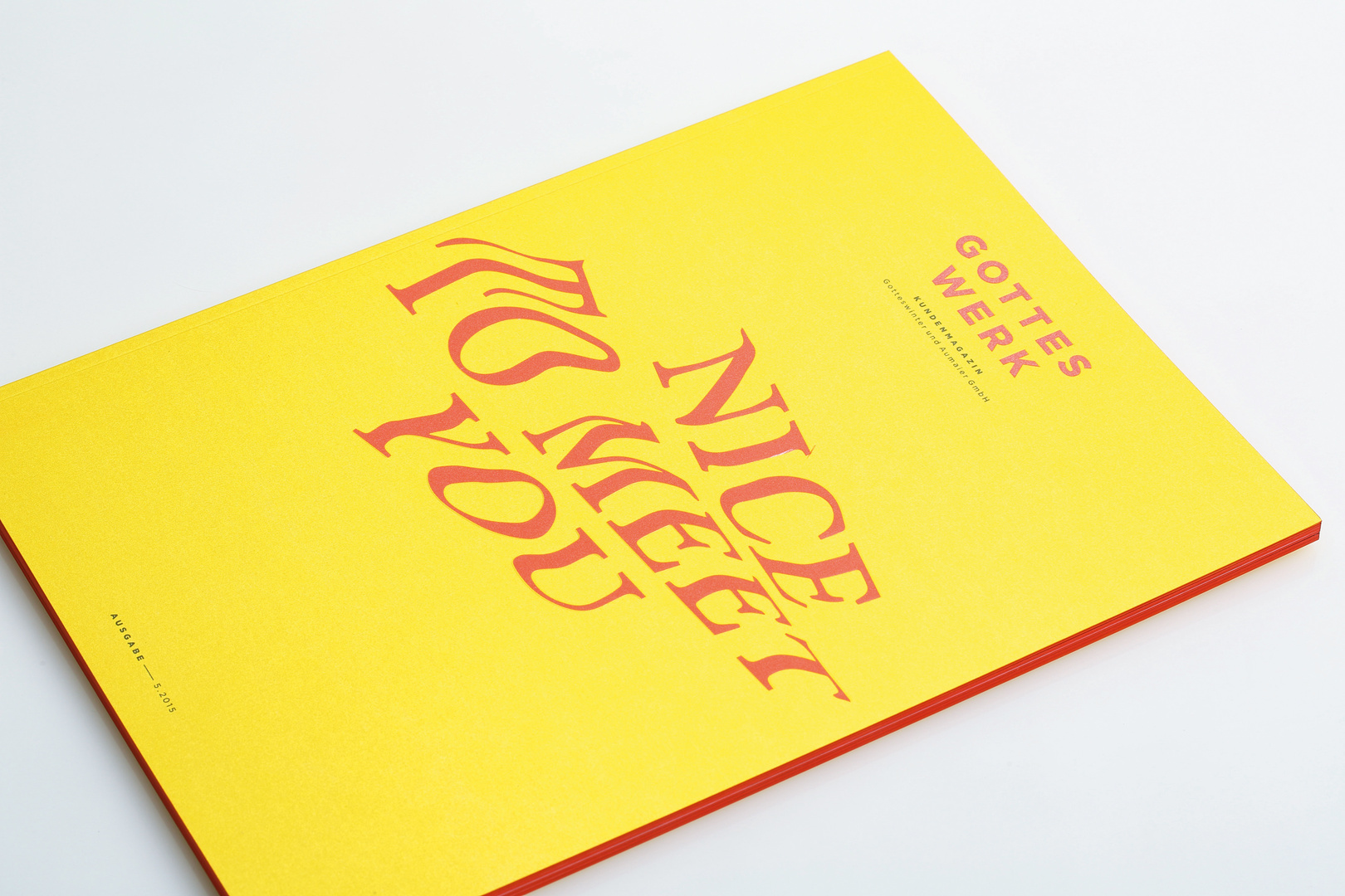 The “Gotteswerk 5.2015” customer magazine deals with various stages of people meeting, exemplified by “You look great!” (first flirt), “Nice to meet you” (become acquainted) and “Clap your hands, say yeah” (be thrilled), with the aim of illustrating the steps of approach between customers and the printing house. The publication itself promotes various typographic refinements, such as embossing and scented paper. A personal interview with Florian Kohler, the director of the Büttenpapierfabrik Gmund, completes the content of the magazine. The red colour cut, with inlaid metallic-yellow fine paper, lends the publication a strong visual appeal.