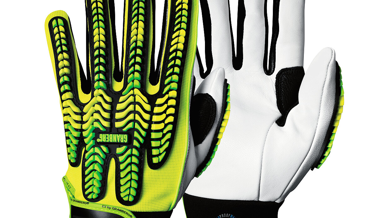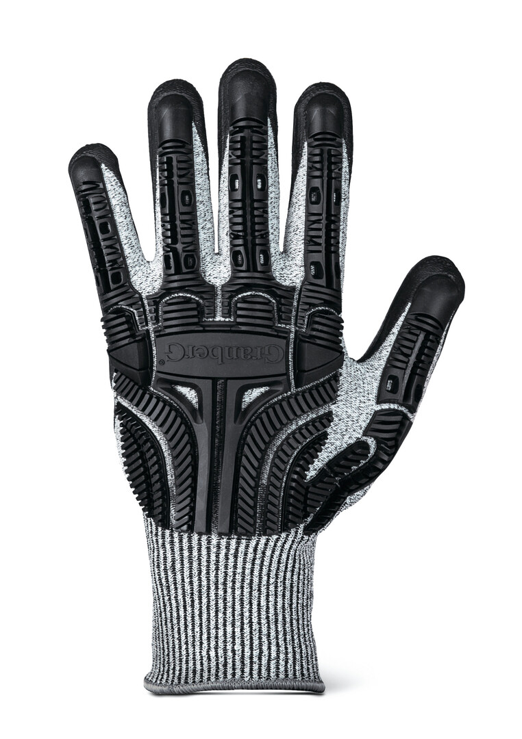 The Granberg 5501 work gloves meet the standards of the highest cut protection class. A flexible impact protection system on the back of the hand guards the user against crushing forces and other impacts, directing it away from the hand in the case of an accident. This is achieved thanks to protective grooves, which run traversely, lengthwise and diagonally across the back of the hand, as well as other impact-protection details in areas where stretching powers are the strongest. The nitrile coating on the palm of the gloves provides a strong grip on dry, wet and oily surfaces.