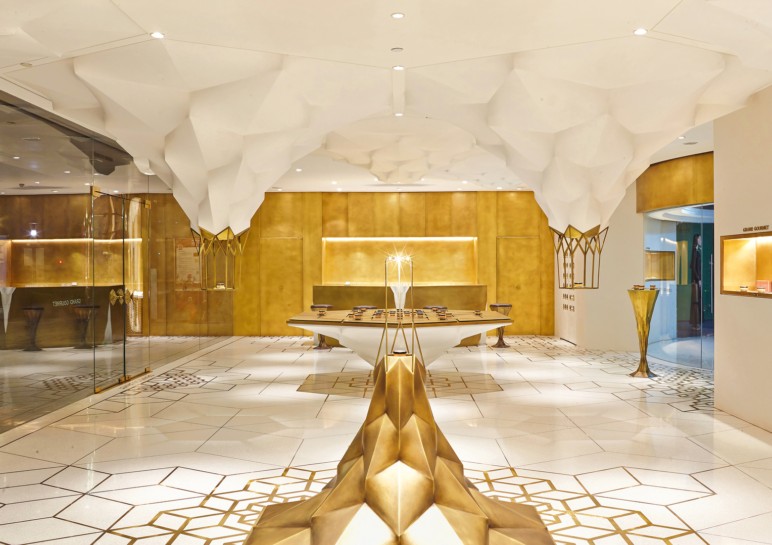 The shop design for the Grand Gourmet flagship store in Shanghai, China, combines a delicatessen shop selling traditional French foie gras with a gallery, a communication space and an event space. Generated by a custom-made computer algorithm, a fractal hexagon pattern serves to organise the shop’s functions and create a strong identity for the entire store. At the same time, the shop applies many traditional handcrafts in creative combination, including a brass bar hand-embedded into the floor, hand-polished brass panels and hand-cast display tables.
