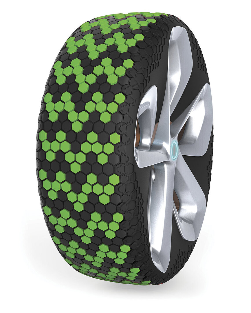 To emphasise the product’s sturdy and eco-friendly concept, this tire adopts a beehive pattern as a motif. Each tread block is generated as a six-pointed beehive pattern. For tire treads, this pattern maximises intensity and stability via the strength and outstanding shock absorbing ability inherent in the hexagonal structure. The tread compound refill is a Thermoplastic Elastomer (TPE) material, which is a physical mix of plastic (at high temperature) and rubber (at room temperature), with both thermoplastic and elastomeric properties. The different types of refill can be visually differentiated via different colours that indicate its use for specific conditions such as road racing, driving on icy road surfaces and more.