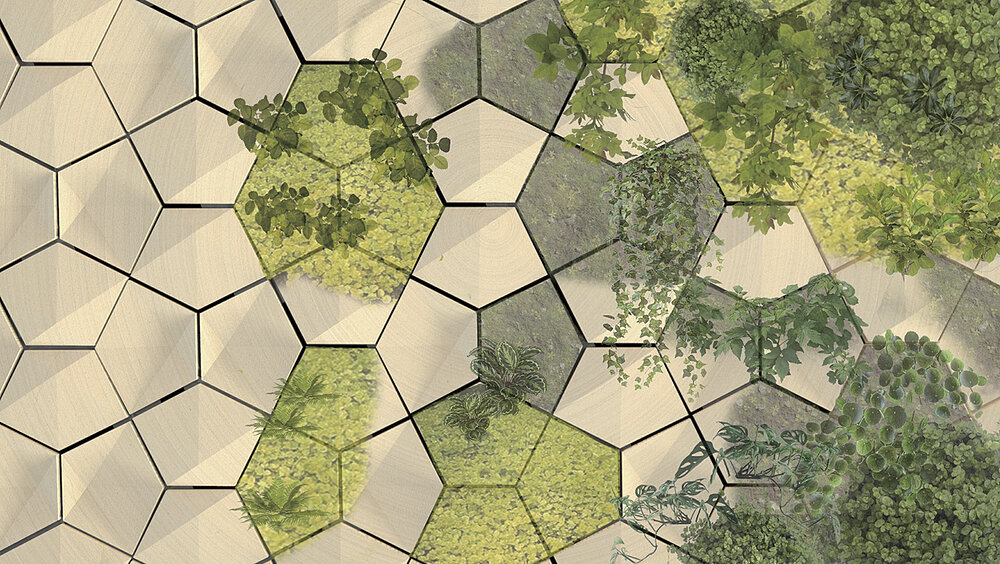 GREEN SLAB combines plant wall with wallboard by putting the seeds of different species inside the wallboard. The seeds grow while absorbing the rainwater, which results in lush greenery and an energising effect on the environment. The pentagon shape allows freestyle combination that fits walls of any size. Moreover, this technique saves water by reusing it, with the plants helping to purify the mildly contaminated water and absorbing the pollutants. This plant wall provides fresh air and cools the temperature of a space, whether indoors or outdoors, and turns a city into a cosy artistic garden. Red Dot Award: Design Concept | Concept | Skin