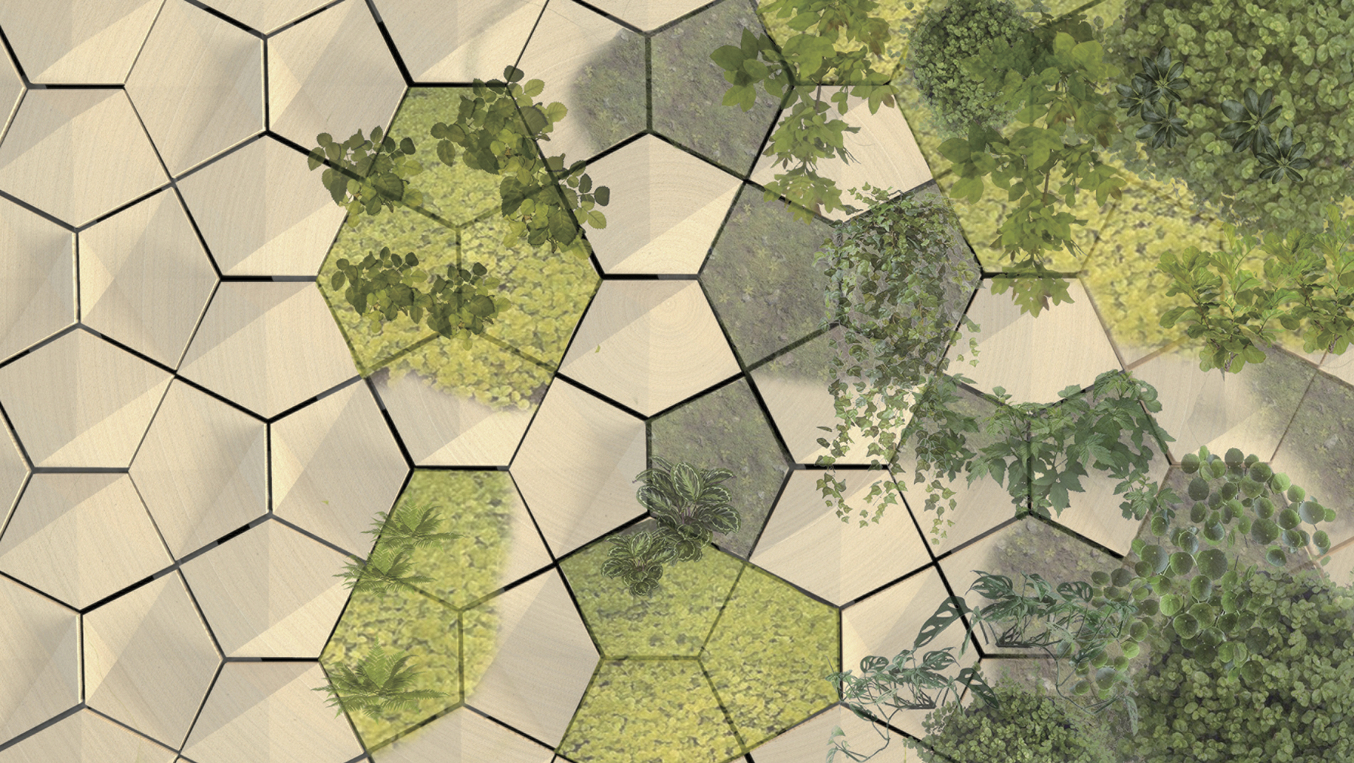 GREEN SLAB combines plant wall with wallboard by putting the seeds of different species inside the wallboard. The seeds grow while absorbing the rainwater, which results in lush greenery and an energising effect on the environment. The pentagon shape allows freestyle combination that fits walls of any size. Moreover, this technique saves water by reusing it, with the plants helping to purify the mildly contaminated water and absorbing the pollutants. This plant wall provides fresh air and cools the temperature of a space, whether indoors or outdoors, and turns a city into a cosy artistic garden.