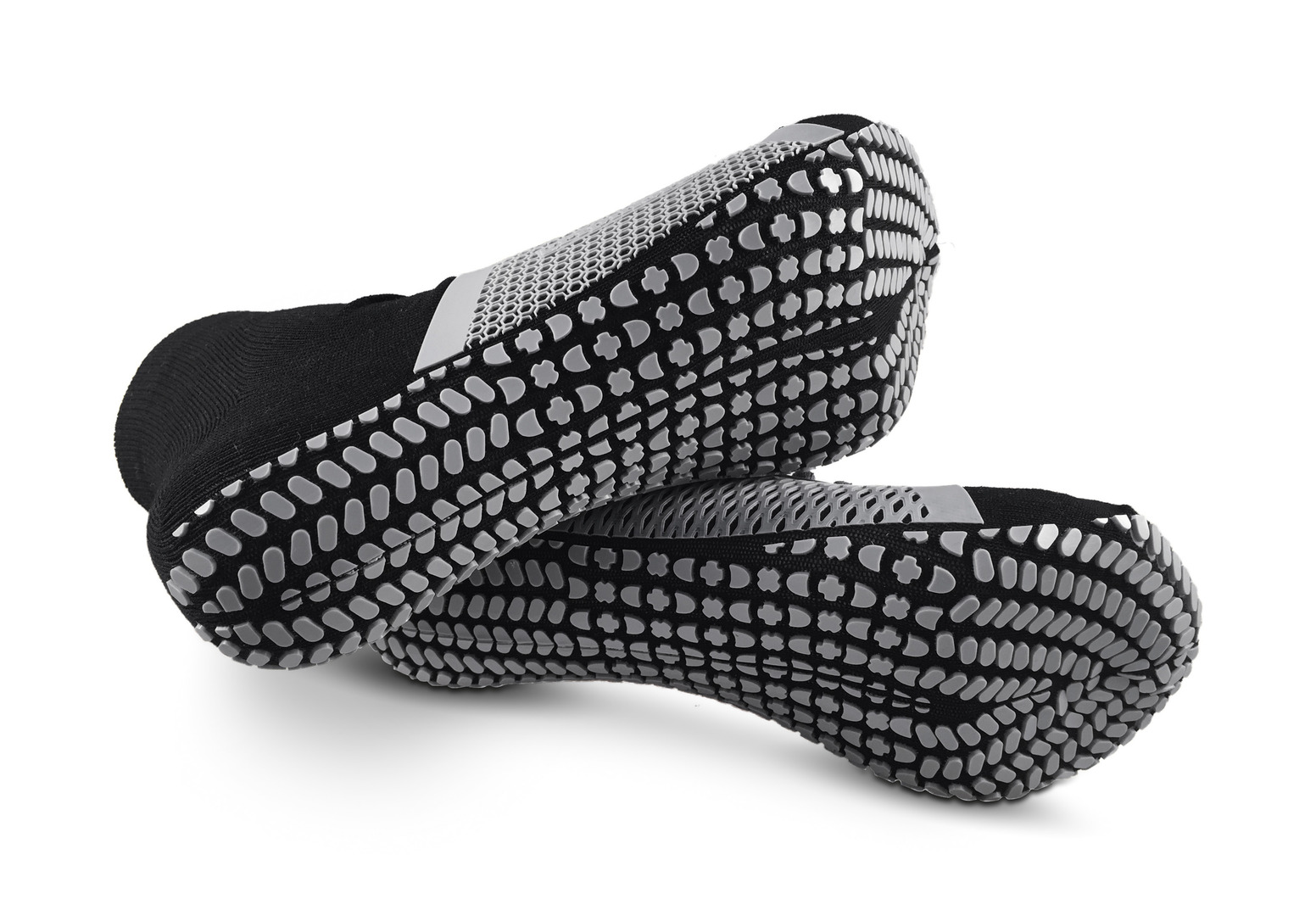 The gripmore sock shoes have been developed as an alternative to conventional sports shoes. They offer feet continuous support when exercising with their integral shoelace and hook and loop closure system, which are attached to the sole of the socks. The actual no-sew upper sock ensures high comfort and creates an extraordinary barefoot experience thanks to its integrated outsole. The abrasionproof outsole, made of eco-friendly polyurethane, covers the toes and heels and protects the feet during movement.