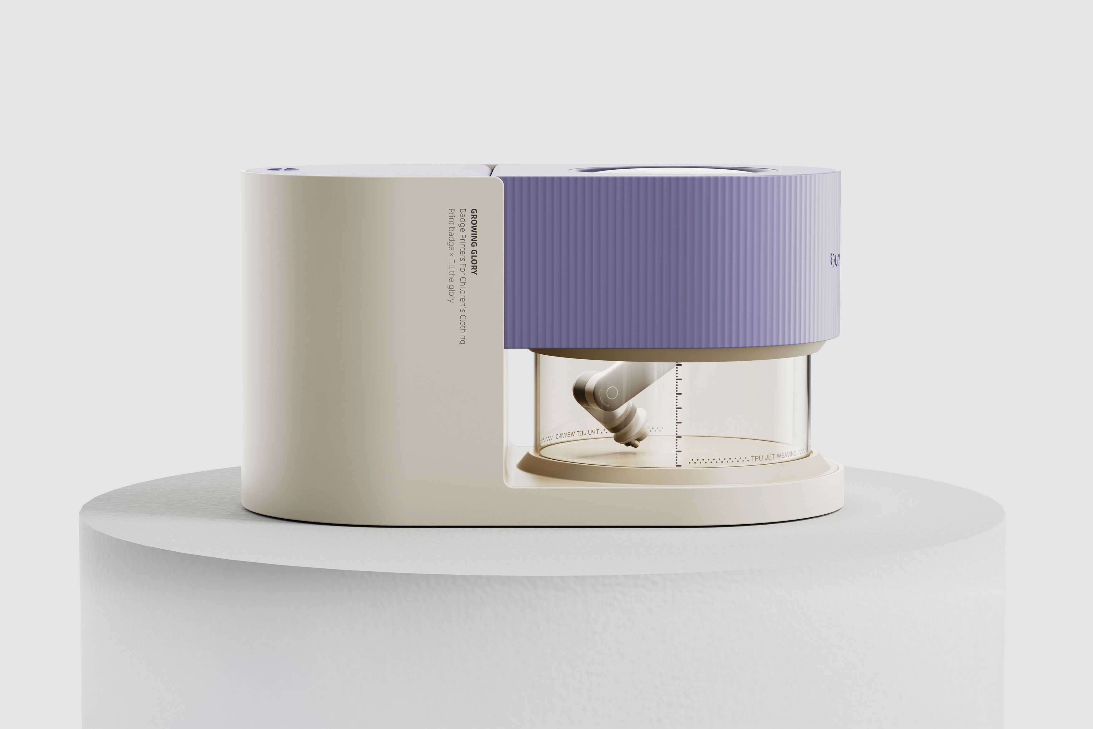 Growing Glory is a patch printer designed to repair rips in children's clothing that occur during play. The printer uses a high-precision scanner to determine the geometry of any hole or rip, then intelligently develops a matching patch pattern and prints it with LightSpray technology. This printer makes repair easy and transforms the process into a meaningful and fun experience.