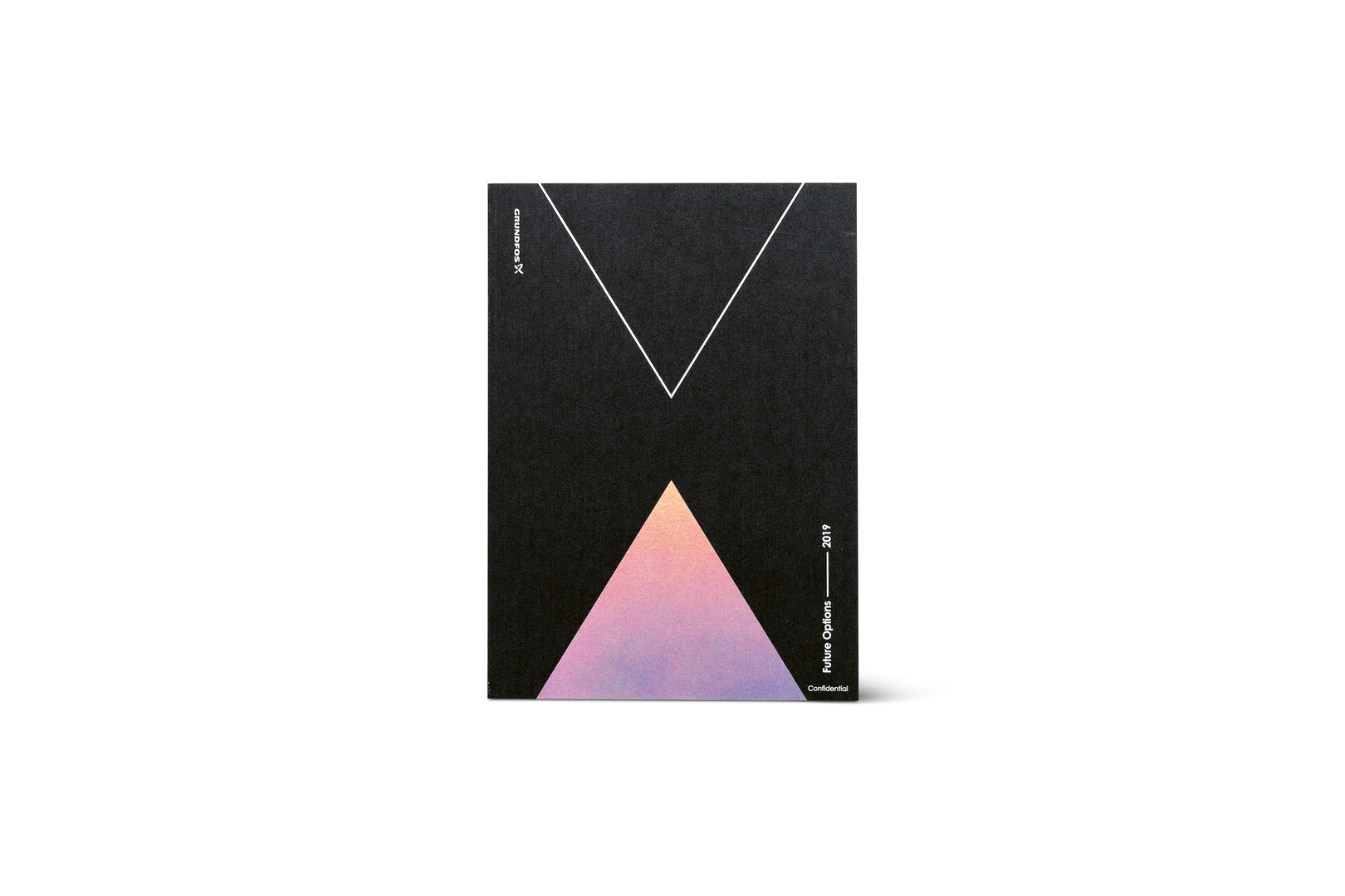 The purpose of Future Options is to ensure the constant availability of long-term, impactful, customer-validated business opportunities for Grundfos. The design of the innovation report follows the theme of looking to the future, grasping and shaping ideas and concepts. A triangular shape represents both mystery and precision, and serves as a base for the entire layout. Multiple triangles in more or less abstract forms illustrate each project and follow the ideas of transformation, changeability, and parts that create a whole. A clean monochrome illustration style based on a triangular isometric grid is used to achieve uniformity across the projects.