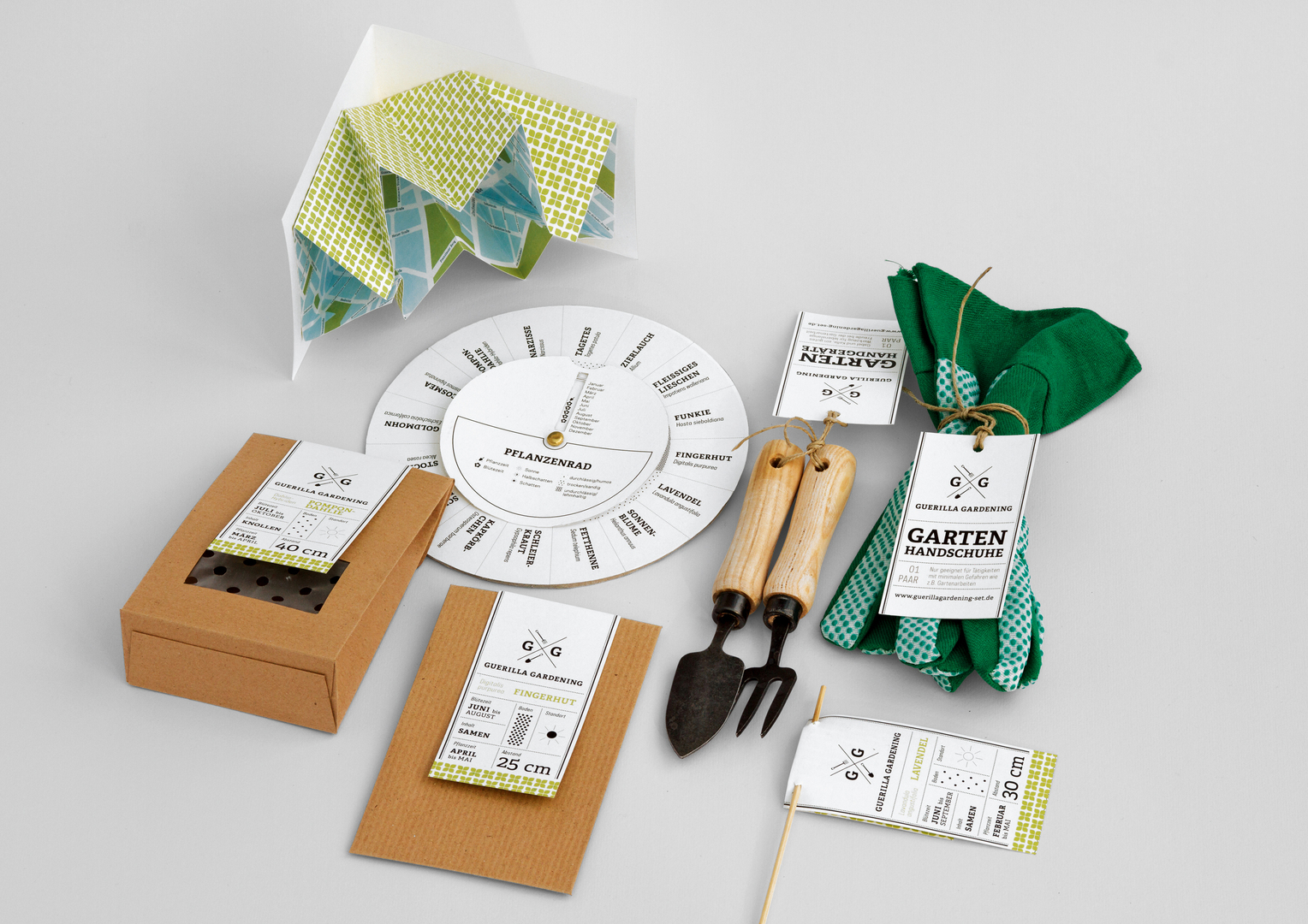 The packaging design of this set was developed with the aim of calling attention to Guerilla Gardening and thus to encourage people to actively shape their environment. Following the idea of civil disobedience, the set is an invitation to practise secret gardening with the aim of embellishing drab concrete and urban asphalt landscapes and turning them into blooming mini-gardens. The individual items of this original and clearly designed set follow the idea of sustainability and were made from environmentally friendly materials such as paper, cardboard, cotton and wood. The set contains pop-up maps, seeds and bulbs, garden gloves and little garden tools as well as a canvas bag, a booklet and a wheel-shaped growth guide. With a logo which combines typography and illustration, the reduced visual identity incorporates graphically plain and understandable solutions in order to illustrate the characteristics of both the bulbs and the plants. Packaged in a small cardboard box, the set is intended for immediate use.