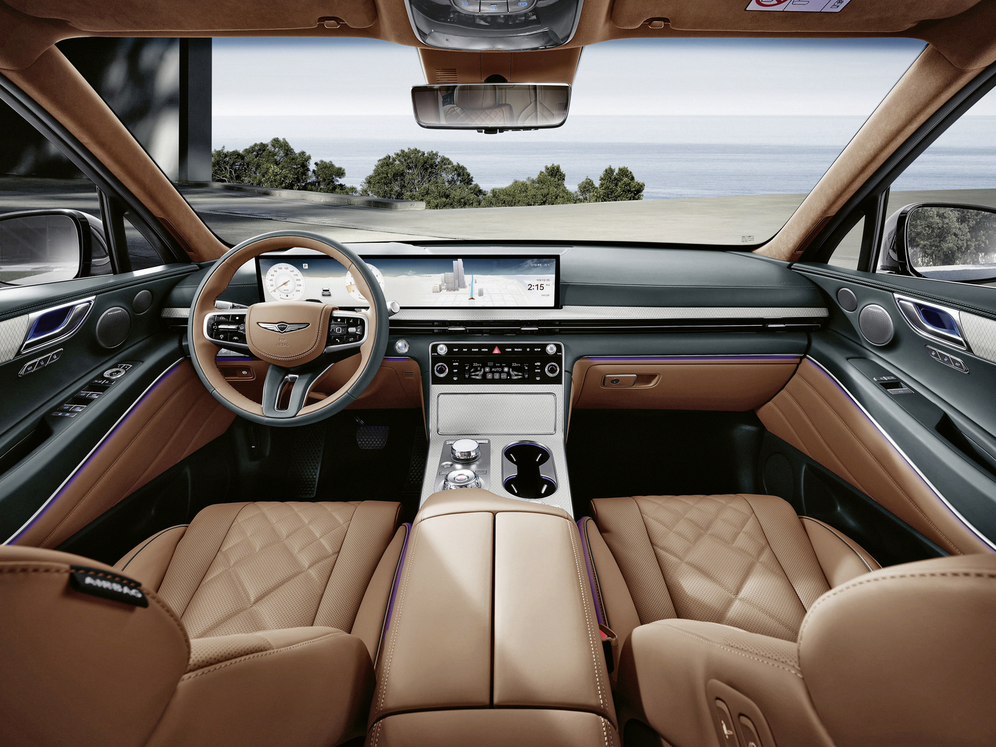 The GV80 Coupe combines the practicality of an SUV with the sportiness of a coupé. The exterior is characterised by a sloping roofline and a parabolic line that create a dynamic and flowing side profile. MLA LED headlights and a striking Crest radiator grille enhance the look of the front section, which is further emphasised by an enlarged air intake, an active air flap and four air vents that support engine cooling.