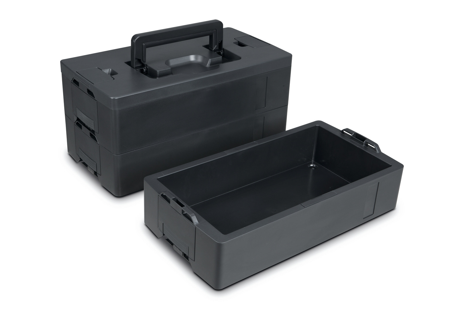 The H-BOXX is a modular presentation system that can be employed as an exhibition display and furthermore offers a high degree of mobility. The individual boxes can be stacked on top of each other and can be connected with the help of a patented, spring-loaded click system to make transport easier. The lid can be completely separated from the body by lifting the built-in and spring-mounted latches. The interior of H-BOXX is as modular as the boxes themselves.