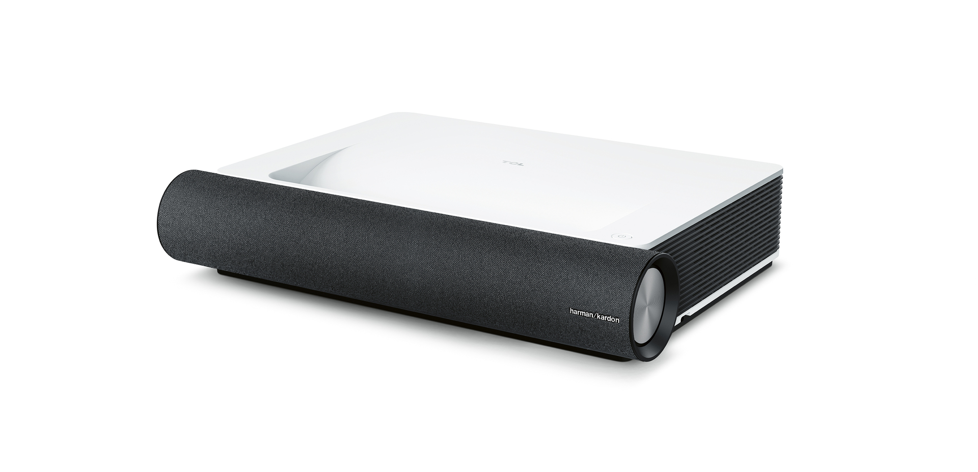 The laser projector offers the user images in 4K quality with outstanding sound. The latter is emphasised by a cylindrically shaped speaker covered with fabric contrasting in colour. The housing itself highlights the inner ventilation system – with three internal fans and a cooler – through circumferential cooling fins, also contrasting in colour. This enables the user to easily grasp the functionality of the projector.