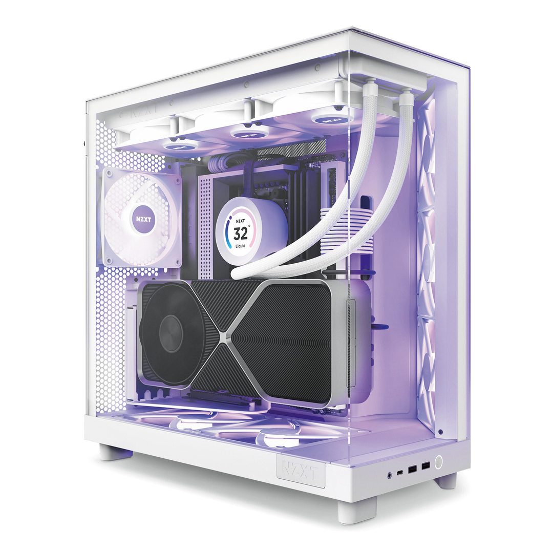 The H6 Flow RGB show case provides a good view of the three case fans, which thanks to their angled arrangement supply the motherboard chamber with a good cooling performance. Unlike comparable products, the panorama glass extends not only across the front, but also one side. Black and white versions are available, either with or without illumination. Users also benefit from simple, tool-free assembly.