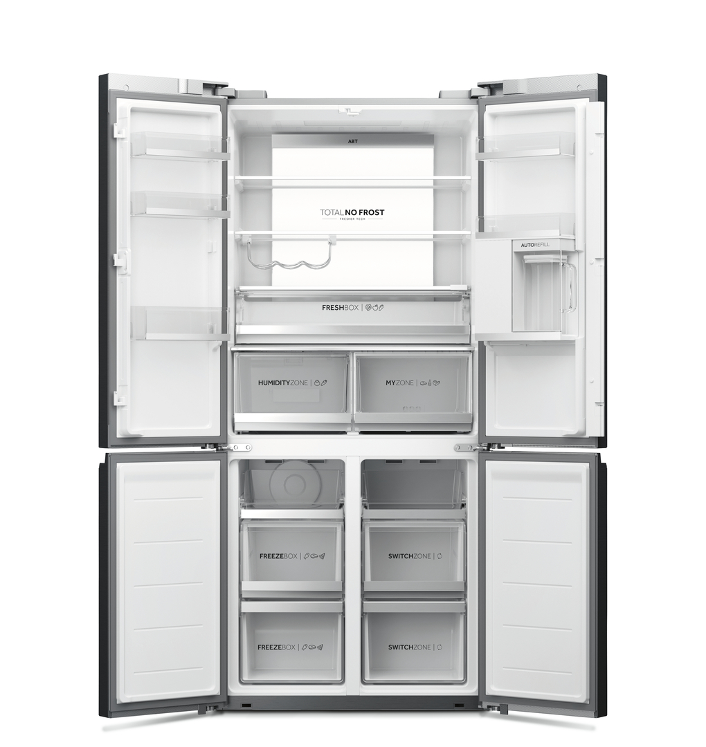 The Haier 830T refrigerator is characterised by clean lines and a high-quality aluminium trim, lending definition to its minimalist appearance. For a permanently attractive exterior, the stainless-steel surface has been refined, reducing dirt and making it easier to clean. Pleasant backlighting in the interior ensures clarity. Further well-thought-out features tailored to the European market include, amongst others, an integrated water and ice dispenser.