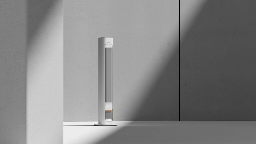 The Haier White Chocolate Tower Fan is a pedestal fan specially developed for households with pets. The antibacterial silver ion coating and the rear filter absorbs animal hair, while the ioniser binds fine particles and pollen, thus improving the indoor air quality. Thanks to its clever design, the removable ventilation grille prevents pets from being injured. The device has a motion-sensitive night light function and can be controlled via a touchscreen display, voice command or an app.