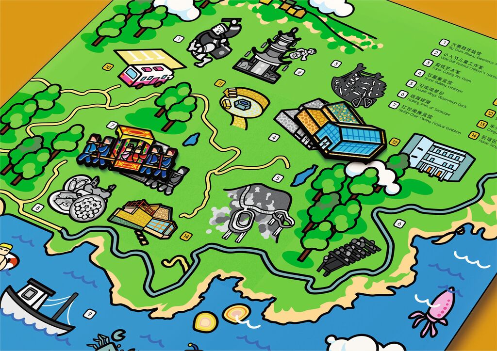 Haili is a small fishing county in Zhejiang, China. The “Stone Nine” cultural festival is held here to promote the area economically and raise funds for restoring Haili’s typical stone houses. Nine colourful key visuals were developed to illustrate the activities of the festival. Featuring a simple graphic style, they reach out to locals as well as participating artists and tourists. The images can be combined to form a complete square, thus referring to the restoration project. The decorative motifs are consistently implemented throughout the brand design, including maps, user interfaces and icons.