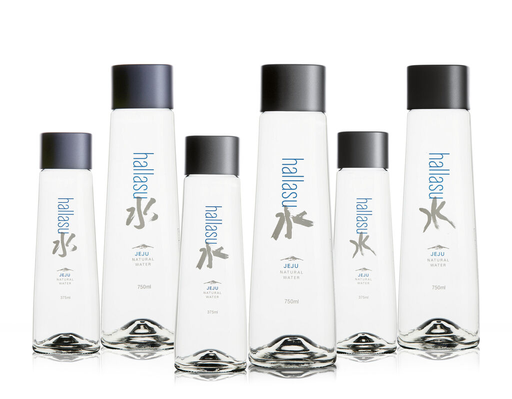 Hallasu is a premium water brand from Korea whose water has its source on Mount Halla on the volcanic island of Jeju. The mountain’s silhouette is reflected prominently in the form of the base of the bottle. The design lines of the vessel with its rounded square basic form are gentle and clear. The black stopper serves as a drinking vessel. The calligraphy of the Chinese character for water dominates graphically the design.