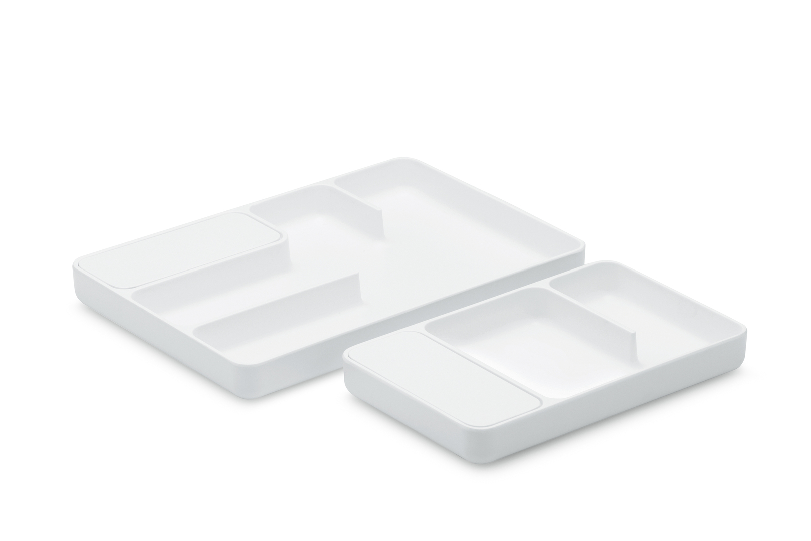 This storage tray is intended to be kept near the front door, so users have handy access to things such as keys when they go out and a convenient place to store them when they return. The generous arrangement of the sections provides a good overview and ensures that everything has its place. The tray’s functional nature makes it possible to sort items by frequency of use. For objects that should be hidden, there is an area with a tilting lid that swings open when light pressure is applied.
