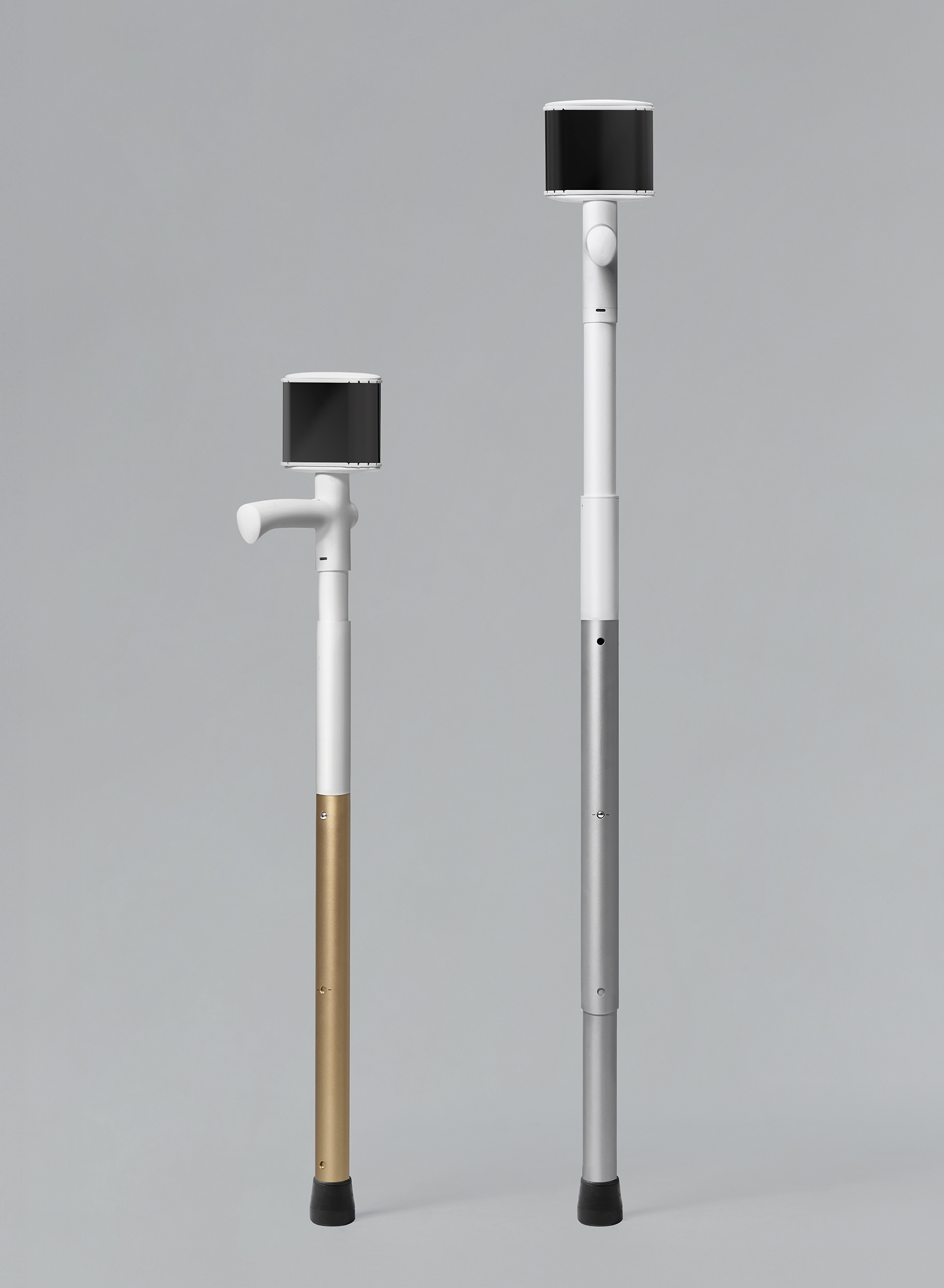 Halo, an intelligent walking cane with a smartphone that automatically adjusts its height by calculating the height of the ground, prevents accidents and provides comfort to elderly people. When using a conventional cane, not being able to adjust the height of the cane while stair walking increases injury development and consequently reduces comfort and control to walk. In addition, since the height of stairs in different places is non-uniform, measuring stairs’ height and adjusting the proper height of the cane whenever stair walking makes the process time-consuming and difficult. To solve this problem, Halo combines a cane and a smartphone, allowing seniors to easily adjust the length of the cane according to the height of the stairs. Halo uses a laser range sensor to calculate the height of stairs. Upon controlling the button on the handle, the cane's height is automatically adjusted to the stairs. Also, changes in a cane’s height can be displayed on a smartphone. Through this performance, Halo offers walking stability by reducing the pressure on the arms and preventing seniors from bending their posture when stair walking. Another noticeable feature of Halo is its smartphone holder. Halo applies a familiar robot face to the holder to bring the seniors closer to the cane. The holder not only rotates to detect obstacles and terrain by attaching a smartphone but also provides emotional interaction for seniors. The flexible phone allows a screen to be used without blind spots when the holder is rotated reducing the risk of accidents. 2-axis gears and DC motors are installed for customised movement. Red Dot Award: Design Concept | Concept | Smart Phones, Tablets and Wearable Technology