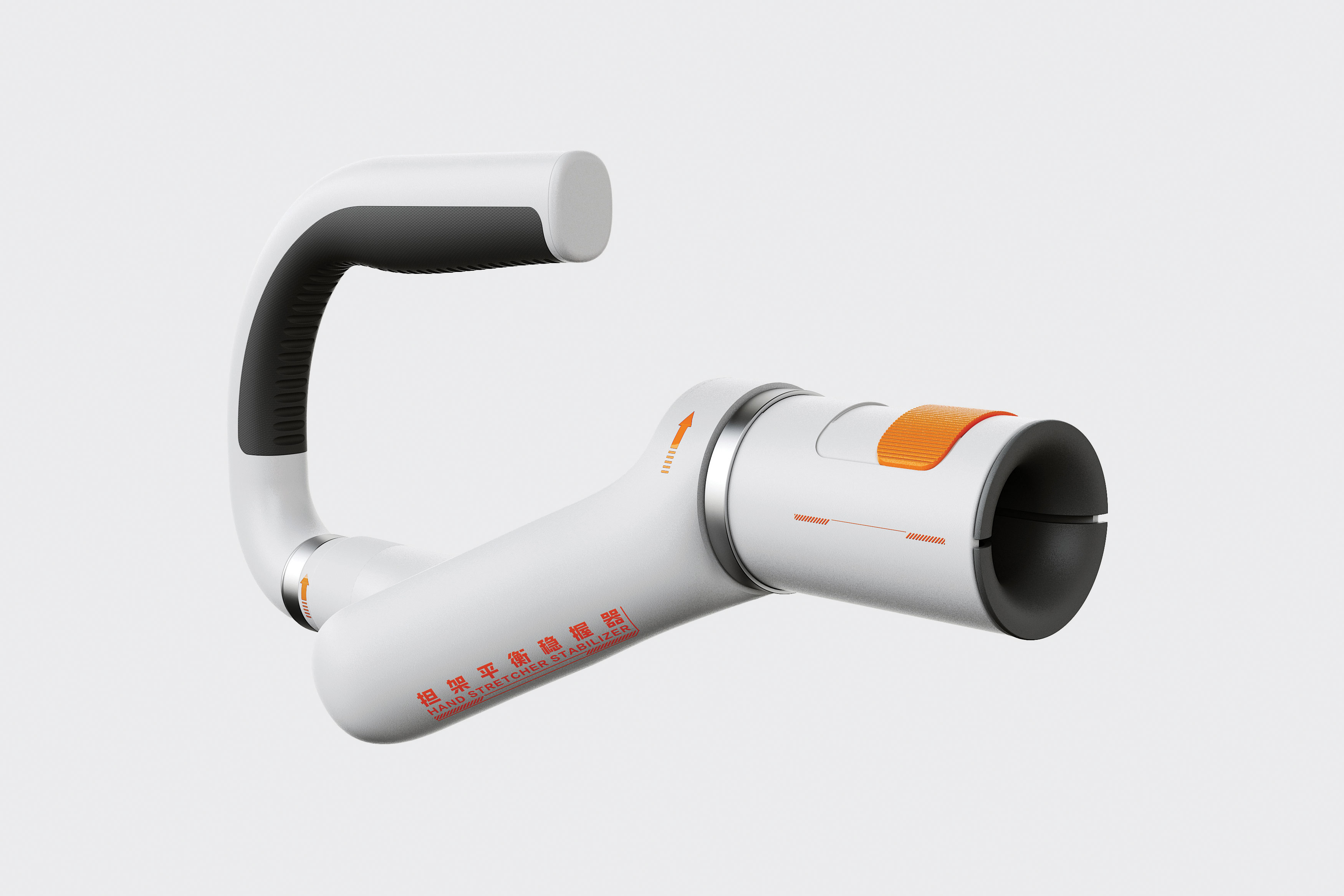This stabiliser can be fitted to standard stretcher handles to minimise movement and reduce the risk of further patient injuries. It has an internal balance stabilisation system that comprises two parts: a momentum balance system that suppresses rotational shaking and a spring balance system that suppresses linear shaking. This structure effectively counters bumps and vibrations to maintain stability during transportation.