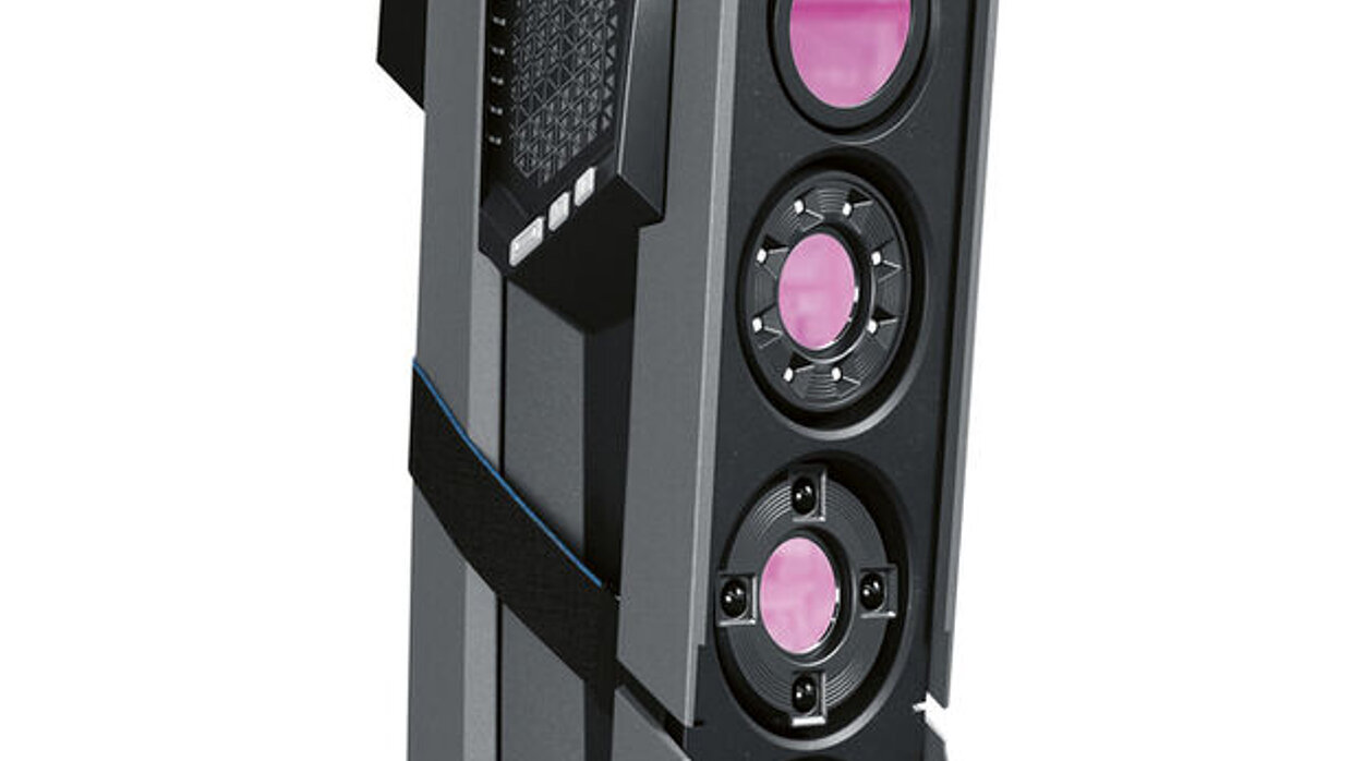 This 3D scanner with blue laser technology enables three-dimensional measurements at exceptional speeds. Well balanced both visually and ergonomically, the design is distinguished by assertive shapes and sleek lines. The optical lenses are aesthetically refined by a blue metallic trim, while the base lends a floating effect to the device. Visible from all angles, the distance metre is seamlessly integrated within the hexagonal shape at the back.