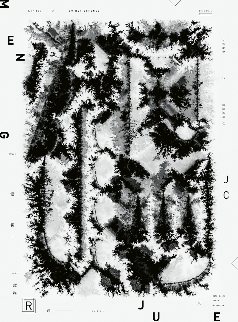 Combining the traditional Chinese ink painting technique with Japan lacquer art, the “Hanhe Mengjue” poster design aims to create a visual language that also expresses a kind of transformation. On a symbolic level, the “Hanhe” generation refers to each person in a cold society, while “Mengjue” references the spirit of contemporary people awakening. At the same time, the collision and mutual integration of the traditional ink painting language of “Jibai Danghei” with the lacquer art of “Jihei Dangbai” also embodies a merging of traditional culture and contemporary visual design.