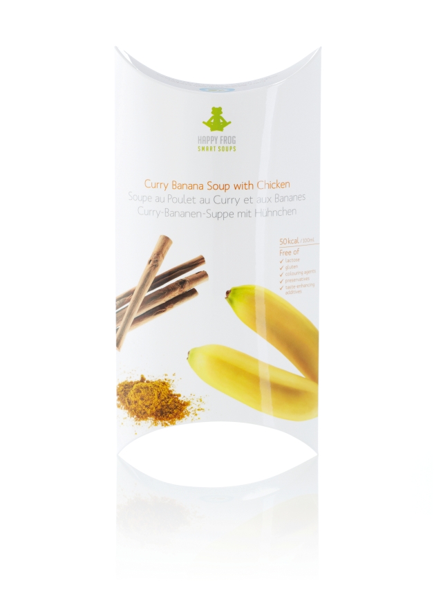 The logo Happy Frog stands for an innovative lifestyle and for health-oriented foods with a primary focus on international soup recipes in France. The product name explicitly reveals that the frog does not end up as a soup ingredient while simultaneously citing Asian philosophy by which the frog stands for luck, health and wealth. The material of the soups’ cushion packaging is commonly used in the cosmetic industry and is cellophane wrapped. Aesthetic illustrations of the ingredients on white ground communicate purity and clarity. A simple visual language, reduced to the basics, complements the minimalistic concept.