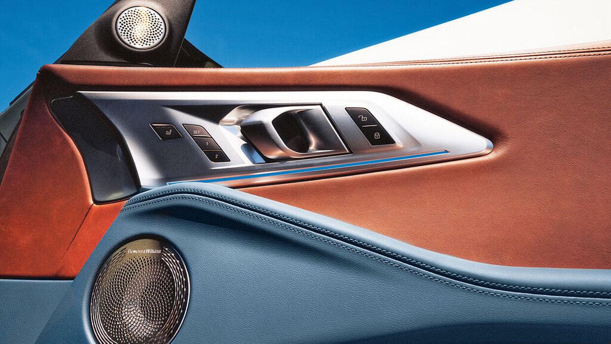 The Harman Kardon for MINI Cooper SE consists of grilles made from stainless steel with a distinctive 60-degree hole pattern, which are integrated carefully into the car’s interior. The horizontal orientation of the pattern, which matches the pattern of the lower part of the door, creates a coherent and harmonious design language. The overall shape of the grille, inspired by the shape of a single hole, is minimalist-chic. The precision-lasered logo and the bevel underline this and reflect the manufacturer’s commitment to detail and quality.