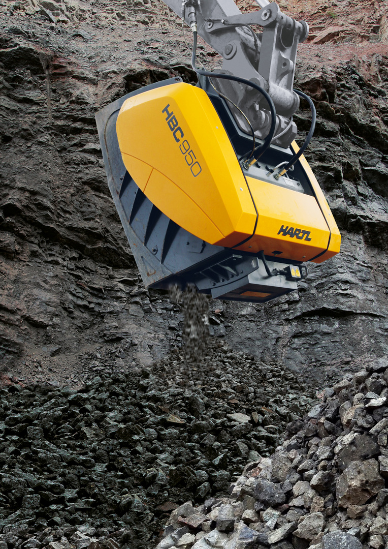 The Hartl Crusher is a fully fledged, robust bucket crusher. The technically robust design of this crushing unit, which is integrated into an excavator bucket, guarantees high performance and reliability for crushing natural stone or recycling building rubble. The compact crusher unit is mounted and connected to an excavator by means of a quick-coupling system. It is driven via the hydraulics of the excavator. The bucket crusher convinces with maximum throughput performance at minimal wear expenditure, as well as with a high-grade cubic and constant final grain. The side panels feature a lightweight construction, are optimised for material strength, and can be dismounted quickly and easily by hand.