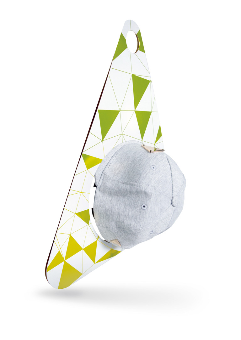 Hat Shelter makes sure that hats do not become squeezed or deformed during handling or transport. Furthermore, this packaging item, with its round recess for hanging, facilitates the storing and the positioning of headwear in business premises. The triangular form is suitable for various styles and hat sizes. With its dynamic graphic pattern on a white background, Hat Shelter stands out strongly. Additionally, the item is manufactured in an environment friendly way to avoid waste.