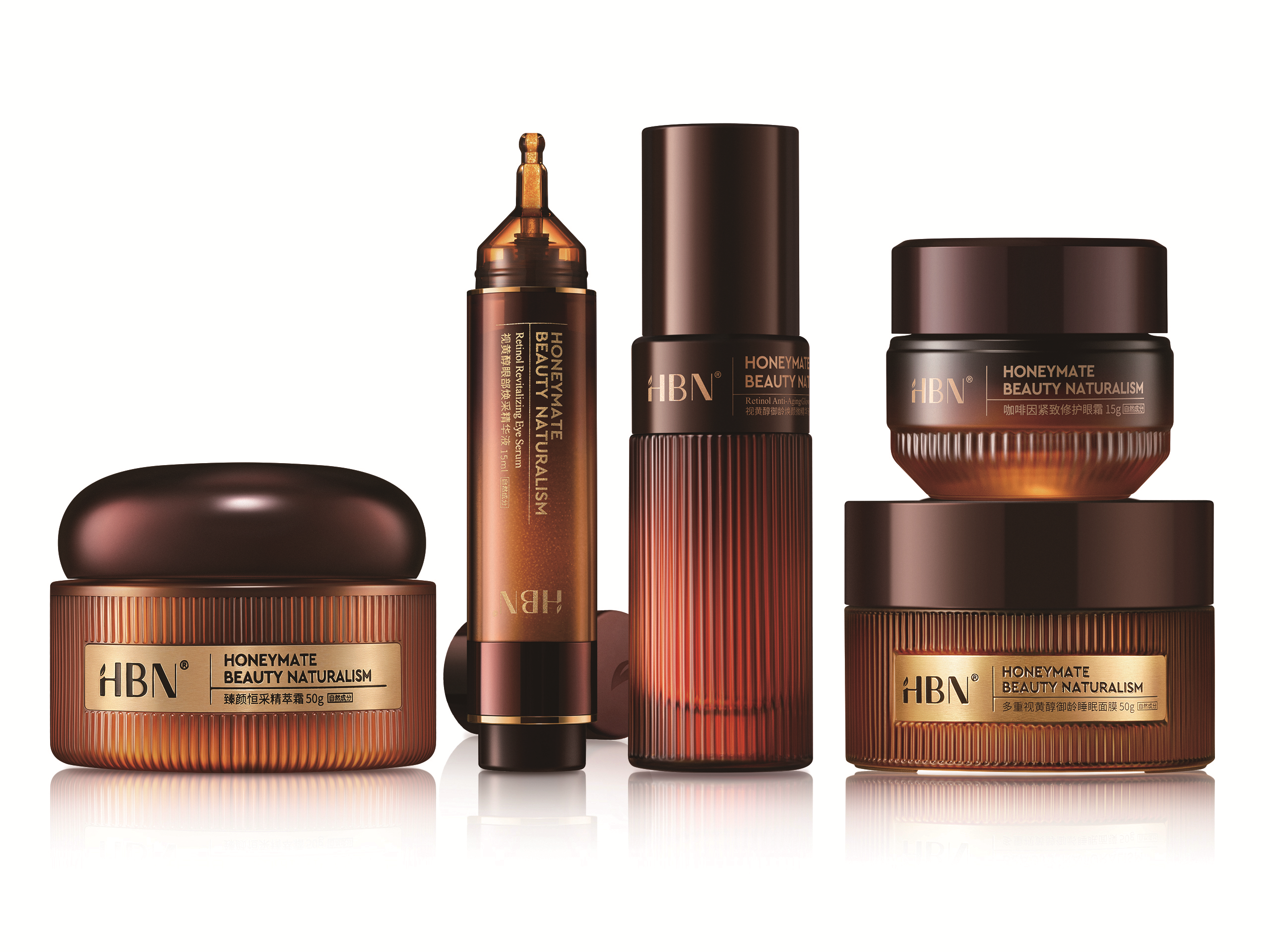 The HBN True Efficacy Anti-Aging Set packaging exudes a sense of luxury and effectiveness, creating a coherent and harmonious look and feel for all products in the series.