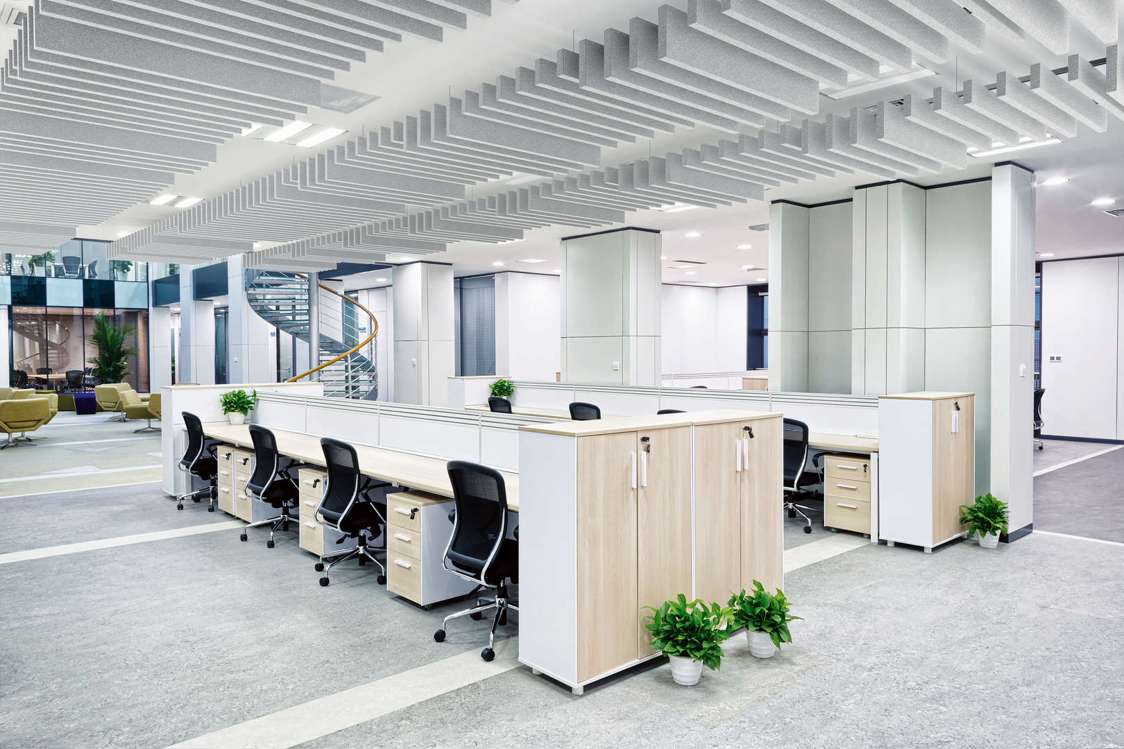 This ceiling system consists of environmentally friendly, recyclable sound absorbing baffles to reduce echo and noise levels. They are made of non-woven thermoformed PES fibres and are 40 to 80 mm wide, 100 to 500 mm tall and up to 2,000 mm long. The baffles come in five shades of grey from black to white and are dirt- and dust-resistant which means they are easy to maintain. The baffle panels are installed using a combi-carrier system. Each panel is attached with steel clips that click into the carrier rail. They are then locked into place with a sliding clip.